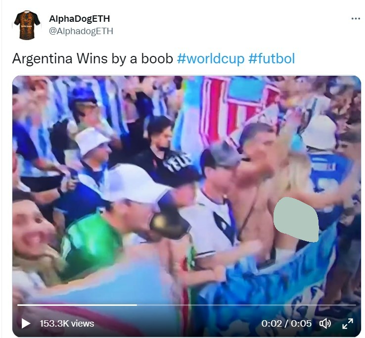 لكن للأسف، اللقطة حقيقة وتم رصدها من مدرجات لوسيل مساء أمس وتحديدًا في اللحظة التي تلت ركلة الجزاء التي نفذها الأرجنتيني "جونزالو مونتيل" في مرمى الديوك، حين انتقلت الكاميرات نحو المشجعين الأرجنتينيين المبتهجين وكان من بينهم المشجعة الشقراء العارية.