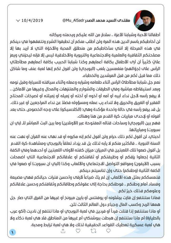 مقتدى الصدر ينتقد لعبة "ببجي" ويهاجم "بي إن سبورت"