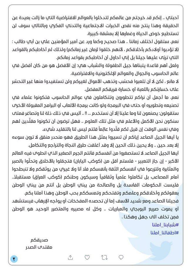 علّق مقتدى الصدر، زعيم التيار الصدري الذي يعتبر أكبر تيار شعبي شيعي في العراق، على تعلق الشباب بالألعاب الإلكترونية والمباريات في جميع أوقاتهم.