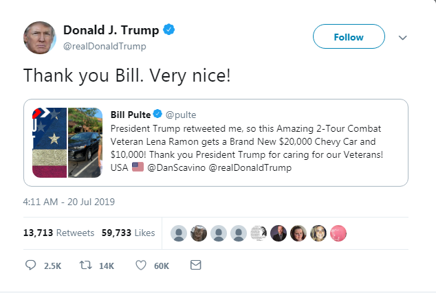 وفاجأ الرئيس الأمريكي متابعيه على موقع التواصل الاجتماعي، بإعادة نشر تلك التغريدة، مرفقا إياها بتعليق: "شكرا لك بيل"، وبدوره، رد بولتي بتغريدة قائلًا: "صباح الخير أيها الرئيس ترامب! بسبب قيامك بإعادة نشر التغريدة، فستتم مفاجأة محارب سابق هذا الصباح بهدية بقيمة 30 ألف، في تمام الساعة الثامنة والنصف صباحًا بتوقيت الساحل الشرقي. تابعوني مباشرة على حسابي. شكرًا".