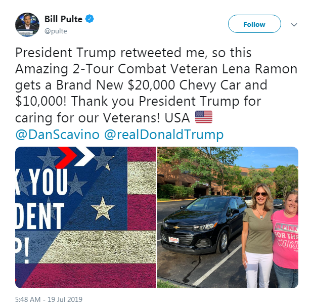 ونشر المليونير ورجل الأعمال "بيل بولتي" تغريدة عبر حسابه الرسمي على موقع التدوين "تويتر" قال فيها بأنه ينوي منح جندية سابقة تدعى "لينا رامون" سيارة بقيمة 20 ألف دولار ومبلغ 10 آلاف دولار، بشرط أن يقوم دونالد ترامب بإعادة نشر هذه التغريدة".