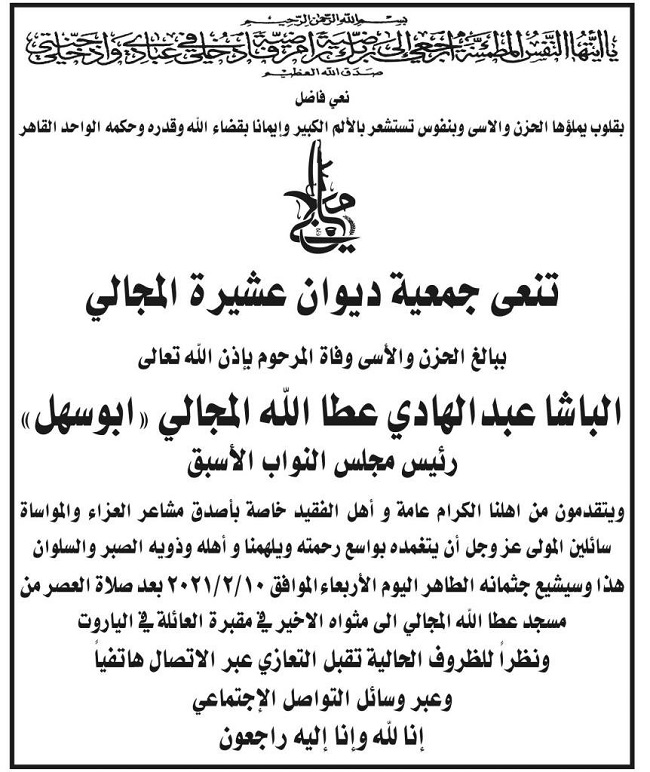 توفي رئيس مجلس النواب الأردني الأسبق عبد الهادي المجالي، في ساعات الصباح الأولى من اليوم الأربعاء 10 فبراير 2021 عن عمر يناهز الـ87 عامًا.