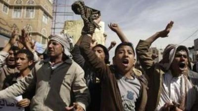 متظاهرون يهتفون بشعارات مناهضة للنظام خارج جامعة صنعاء
