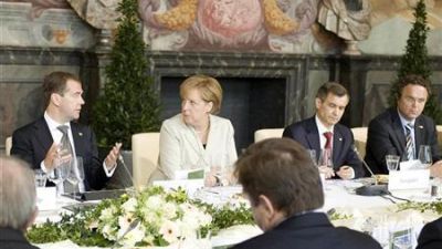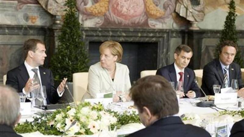 الرئيس الروسي (إلى اليسار) يتحدث الى المستشارة الالمانية خلال مأدبة غداء في هانوفر