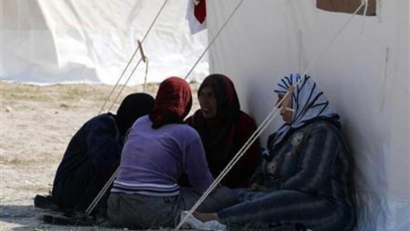 سوريات يجلسن في مخيم للنازحين السوريين في بلدة باقيلم هاتاي التركي على الحدود مع سوريا