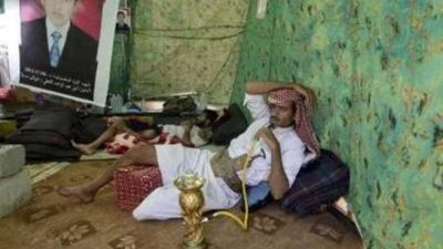 يمني يدخن الارجيلة داخل خيمة في ساحة الاعتصام في صنعاء