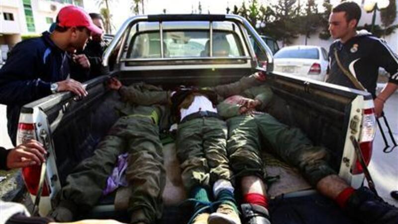 اسرى جرحى من قوات القذافي على ظهر مركبة امام مستشفى في مصراتة