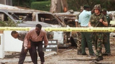 جندي اميركي يقف حارسا بعد الانفجار الذي استهدف السفارة الاميركية في دار السلام في العام 1998