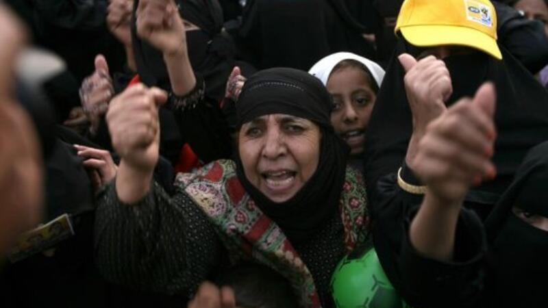 ورفع المشاركون اعلاما سوداء اللون ورددوا هتافات تندد بصالح الذي تولى السلطة في 17 تموز/يوليو 1978.