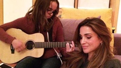- في الصورة الأولى الملكة مسترخية على أنغام أطربتها بعد يوم طويل في العمل، تستمع الى عزف واحدة من ابنتيها على الغيتار.