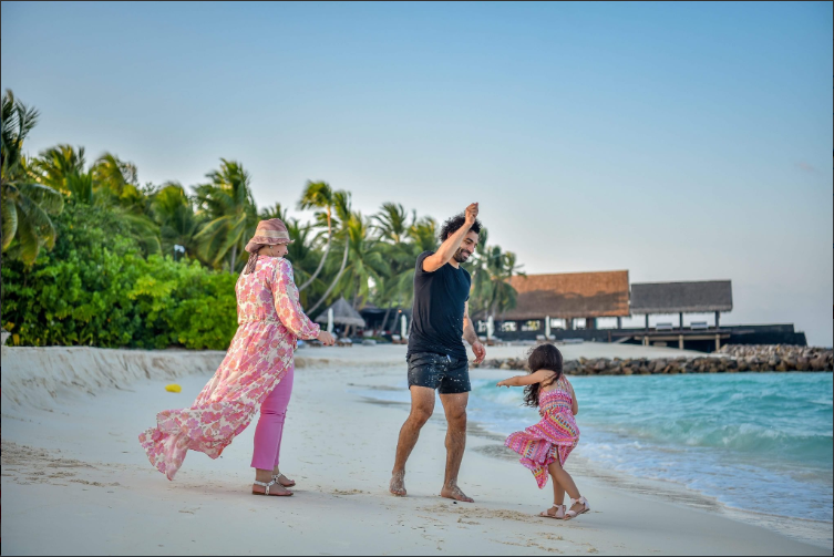 وظهر صلاح في الصورة وهو يداعب ابنته "مكة" وبجواره زوجته على الشاطئ.