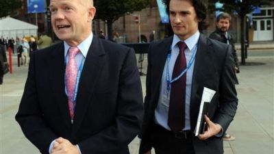 وزير الخارجية البريطاني، وليام هيغ، ومساعده المستقيل،كريستوفر مايرز/ا.ف.ب