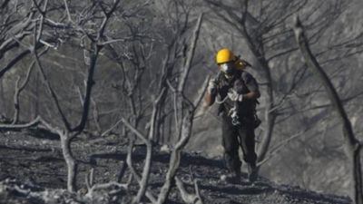 رجل اطفاء اسرائيلي يقف وسط اشجار اتت عليها النيران