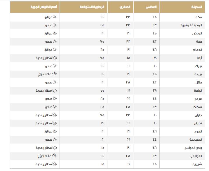 تجدر الإشارة إلى أنه على الرغم من الاضطراب العام الذي يجتاح حالة الطقس اليوم في السعودية إلا أن الأرصاد قد أكدت على أن الطقس لا يزال في حيز الحرارة إلى شدة الحرارة خاصةً في القصيم والرياض، وأما درجات الحرارة نعرضها على النحو التالي: