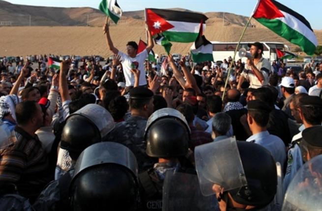 معبر "اللنبي" على نهر الأردن عند الحدود مع إسرائيل: أصيب 6 أشخاص على الأقل عندما تدخلت الشرطة لمنع 500 متظاهر من التوجه إلى الحدود.