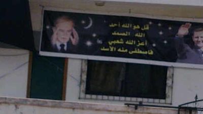 "نشر ناشطون سوريون على شبكة الانترنت صورة تظهر مدى هوس بعض الموالين للنظام السوري ببشار الأسد ووالده, لدرجة أنهم حرفوا سورة الإخلاص بما يتناسب مع هذا الهوس" .