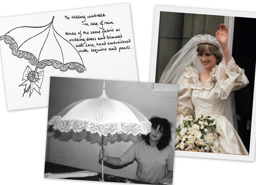 ونظرا للطقس الرمادي إلى حد ما في إنجلترا، قامت إليزابيث إيمانويل بتصنيع مظلتين حريريتين عتيقتين، والتي اشترتهما من دار مزادات فيليبس وقد غطتهما بالقماش العاجي والأبيض، واستخدمت ال"دونتيل" من الفستان لإضفاء زخرفة على كل منهما، واللؤلؤ والترتر المطرز عليهم. وقالت إليزابيث لصحيفة "ديلي ميل" أن اللونين تم استخدامهما "حتى لا يعرف أحد اللون الذي يناسب فستانها". ولحسن الحظ مر ذلك اليوم من دون هطول الأمطار وهو ما كان مصدر ارتياح لإليزابيث مصممة الفستان.