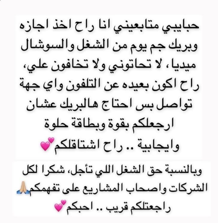 وجاء في المنشور الذي شاركته عبر حسابها على تطبيق "سناب شات"، التالي: "حبايبي متابعيني، أنا راح أخذ إجازة وبريك جم يوم من الشغل والسوشيال ميديا، لا تحاتوني ولا تخافون علي، راح أكون بعيدة عن التليفون وأي جهة تواصل".