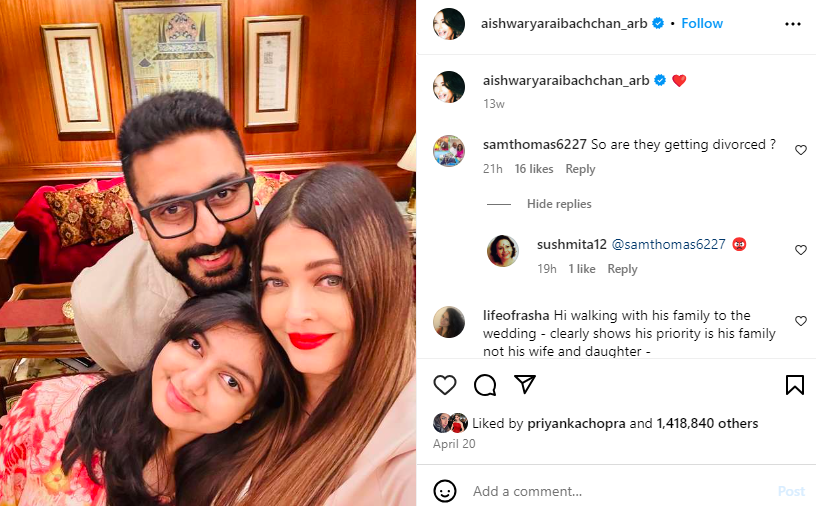 وكشفت مصادر إن سبب وضع باتشان الإعجاب على هذا المنشور، ليس إشارة على مشاكل بينه وبين آيشواريا، وان السبب هو مشاركة زيراك ماركر وهو صديق مقرب من آيشواريا في هذا المقال الذي شاركته الكاتبة، ودعمًا له.