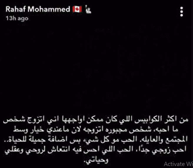 وكانت رهف قد شاركت صور لزوجها وطفلها أول مرة منذ أشهر قليلة وأرفقتها بتعليق "أريد أن أقضي بقية حياتي معك وأن أربي طفلنا ليكون قوياً مثلنا. أحبك وسأفعل ذلك دائمًا"، وفي منشور آخر صرحت أنه من غير الممكن أن تتزوج شخصا لا تحبه كما أكدت حبها لزوجها. وأضافت "من أكثر الكوابيس اللي كان ممكن أواجهها إني أتزوج شخص ما أحبه، شخص مجبورة أتزوجه لأن ما عندي خيار وسط المجتمع والعائلة"، وتحدثت عن الحب بأنه ليس كل شيء بل هو إضافة جميلة للحياة.