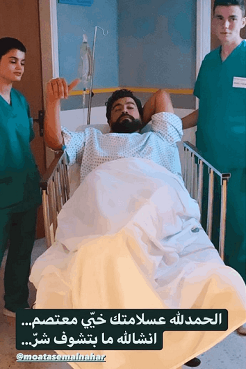 نشر المخرج جو بو عيد في الساعات الماضية صورة للممثل السوري معتصم النهار داخل المستشفى، حيث كان يتلقى العلاج وكتب معلقا: (الحمدالله على سلامتك خي معتصم، انشالله ما بتشوف شر).