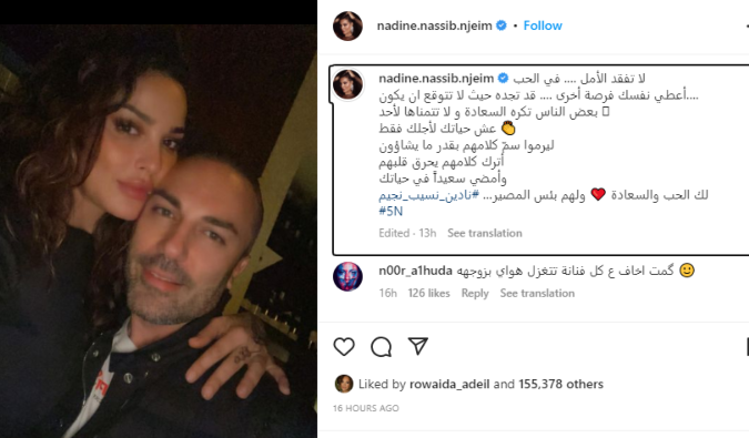 على صعيد آخر، شاركت نجيم متابعيها عبر حسابها في "إنستغرام" صورة جديدة لها مع خطيبها ناريك، أرفقتها برسالة تحفيزية تدعو لعدم فقدان الأمل بالعثر على الحب، وكتبت: "لا تفقد الأمل في الحب..أعطي نفسك فرصة أخرى.. قد تجده حيث لا تتوقع ان يكون..بعض الناس تكره السعادة و لا تتمناها لأحد..عش حياتك لأجلك فقط ".