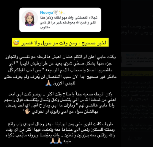 من جهتها، حرصت سارة الودعاني، شقيقة نجلاء، على دعمها في هذه الفترة الصعبة، وأعادت نشر رسالة شقيقتها عبر “سناب شات”، مضيفة كلمات مؤثرة: "استودعت الله قلبك ومشاعرك وعيالك… الله يعوضكم وييسر لكم كل خير.”