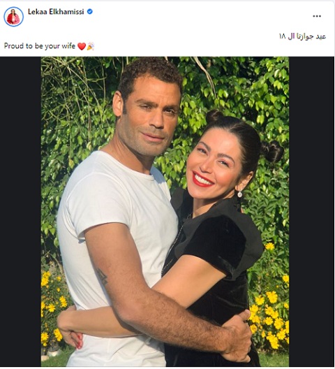 نشرت الفنانة لقاء الخميسي، صورة لها عبر حسابها الشخصي على موقع التواصل الاجتماعي (فيسبوك)، برفقة زوجها اللاعب محمد عبد المنصف (أوسة)، حارس مرمى نادي الاتحاد السكندري، وحارس الزمالك السابق، احتفالا بمناسبة عيد زواجهما، وعلقت لقاء الخميسي على الصورة: (عيد جوازنا الـ18.. فخورة بكوني زوجتك).
