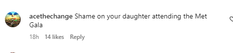 ويتعرض حديد للانتقاد والهجوم على كل منشور، حيث قال له أحد المتابعين: "عار على ابنتك ان تشارك في حفل ميت غالا".