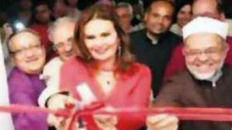 وظهر عزب خلف يسرا مبتسما، في حين امسك جميعه بالشريط الذي قامت بقصه في احد الاحتفاليات، حسب صحيفة الأنباء.