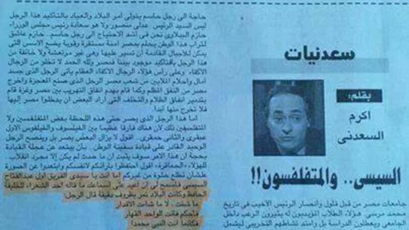 ذهب احد الكتاب المصريين ويدعى "أكرم السعدني" بعيدا في تأييده للفريق عبدالفتاح السيسي الى حد وصفه بـ “الواحد القهار” وأثار المقال الذي نشره بعنوان “السيسي والمتفلسفون” موجة انتقادات حادة من جانب نشطاء سياسيين، ورواد مواقع التواصل الاجتماعي، احتجاجا على أ[بيات شعر توجه بها السعدني في مقاله للفريق السيسي قائلاً " ما شئت أنت لا ما شاءت الأقدار،فاحكم فأنت الواحد القهار..فكأنما أنت النبي محمد، وكأنما أنصارك الأنصار”: