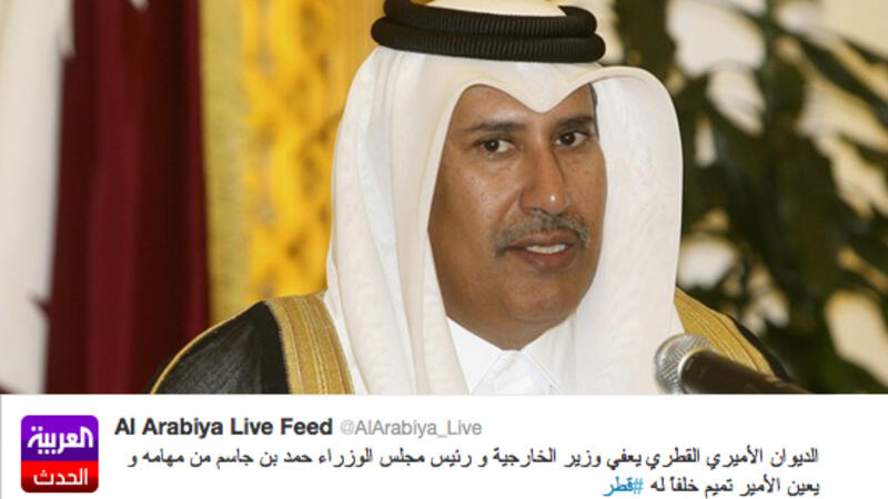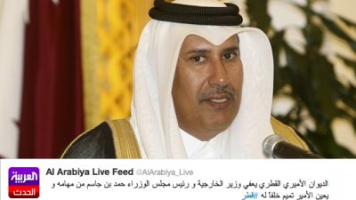 بث حساب “العربية عاجل”  على موقع التواصل الاجتماعي تويتر خبرا مفاده أن الديوان الأميري القطري أعفى وزير الخارجية و رئيس مجلس الوزراء حمد بن جاسم من مهامه و يعين الأمير تميم خلفاً له، كما نشر خبرا آخر مفاده أن انفجارا حدث في الدوحة بأحد حقول الغاز التابعة لمؤسسة قطر بتروليوم و سقوط عشرات الضحايا.لكن الاستاذ خالد المطرفي المدير الإقليمي لقناة العربية في السعودية أفاد أن الحساب الخاص بالقناة في تويتر قد تم اختراقه، وأن كل الأخبار التي بثت من خلاله عن دولة قطر غير صحيحة.وكان مسؤول في موقع العربية نت أطلق على نفسه “كبير محرري الموقع الالكتروني للعربية” نشر قبل أيام خبر على صفحته الخاصة في موقع تويتر يتحدث عن انقلاب عسكرى فى قطر ليعود بعد ذلك ويعتذر عن الخبر، هاشتاغ #اختراق_العربية‬‏ قام بإنشاءه المغردون للتكلم عن الخبر:
