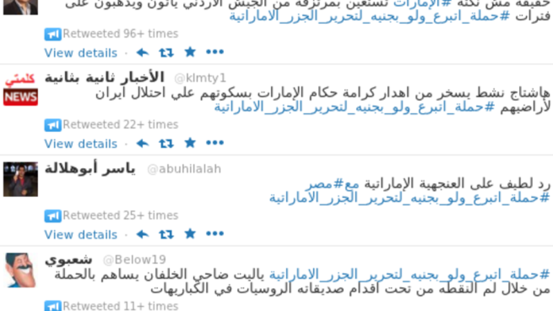 اعتبر الكثيرون من المصريين ان دولة الامارات وفي خضم حربها ضد الاخوان المسلمين تدخلت وبقوة بالشأن الداخلي المصري للتخلص من حكم الاخوان المسلمين في مصر، ورغم أن هذا الامر لقي ترحيبا كبيرا من البعض الا انه لم يعجب الكثير من المصريين خصوصاً من أنصار الاخوان المسلمين والرئيس مرسي، وكنوع من الرد الساخر على هذا التدخل قام أحد المغردين بإنشاء هاشتاغ ساخر #حملة_اتبرع_ولو_بجنيه_لتحرير_الجزر_الاماراتية ولم يقتصر الهاشتاغ على المصريين فقد جذب عدد لا بأس به من الخليجيين الرافضين لسياسة الامارات ضد الاخوان المسلمين: