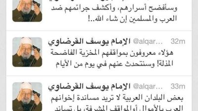 كتب الشيخ يوسف القرضاوي على حسابه في موقع التواصل الاجتماعي تويتر تغريدة قال فيها "بعض البلدان العربية لا تريد مساندة إخوانهم العرب بالاموال او المواقف المشرفة بل تساند غيرهم من الفرنسيين أو بعض الاوروبيين" "هؤلاء معروفين بمواقفهم المخزية الفاضحة المذلة، وسنتحدث عنهم في يوم من الأيام" "وسأفضح أسرارهم وأكشف جرائمهم ضد العرب والمسلمين إن شاء الله" وقد رأى العديد من المغردين أن هذه التغريدات تحمل ايحاءاً عن دولة الإمارات العربية المتحدة وأنه بالتالي يهدد دولة الإمارات مما أثار غضب العديد منهم فكتبو معلقين: