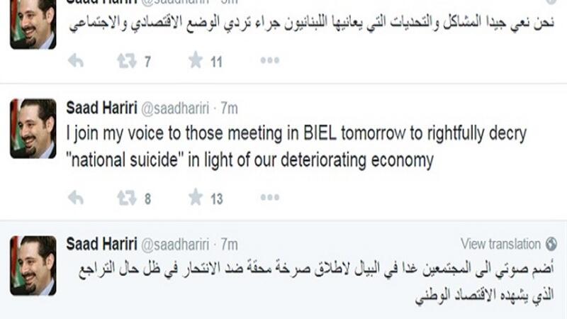 كتب سعد الحريري رئيس الوزراء الأسبق في لبنان تغريدة على تويتر "أضم صوتي إلى المجتمعين غدا في البيال لإطلاق صرخة محقة ضد الانتحار في ظل حال التراجع الذي يشهده الاقتصاد الوطني".