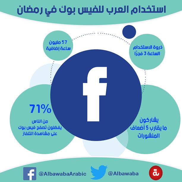 وحسب بحث إحصائي أجراه موقع التواصل الاجتماعي "فيسبوك" فإن المستخدمين العرب سيمضون 57 مليون ساعة إضافية على الموقع خلال شهر رمضان المبارك، مما يعني أرباحًا إضافية سيكسبها الموقع في الشهر الفضيل كما ورد في موقع سكاي نيوز.
