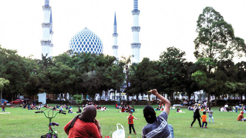 صور التقطت أمس لأسر ماليزية تجلس قبل موعد أذان المغرب على العشب في الحديقة العامة أمام جامع السلطان صلاح الدين في مدينة شاه علم بولاية سيلانجور(الأوروبية).