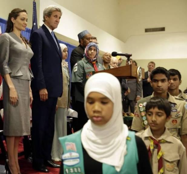 شاركت النجمة أنجلينا جولي، مع وزير الخارجية الأميركي جون كيري، في مأدبة إفطار رمضاني في مدينة فرجينيا الأميركية، بمناسبة يوم اللاجئين العالمي.