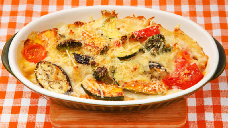 - في صينية بايركس، وزعي كوبًا من البشاميل في قاع الصينية، ثم وزعي الخضار فوق البشاميل.