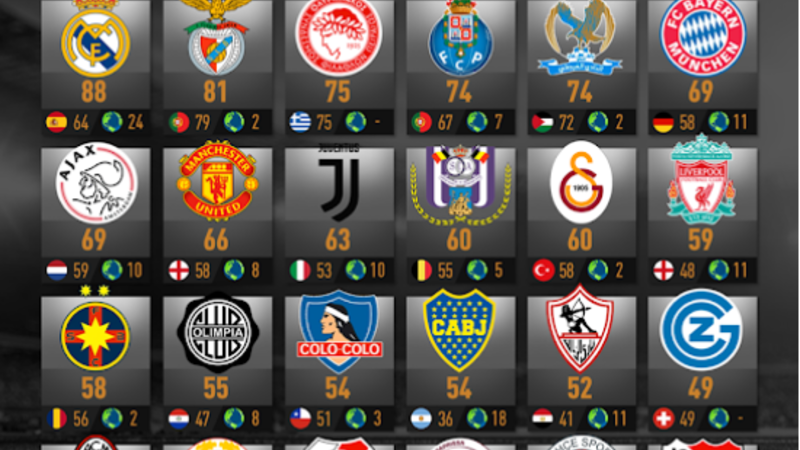 وشهدت القائمة تواجد عدد كبير من الأندية الأوروبية، لكن الصدارة ذهبت للأهلي المصري برصيد 118 لقباً.