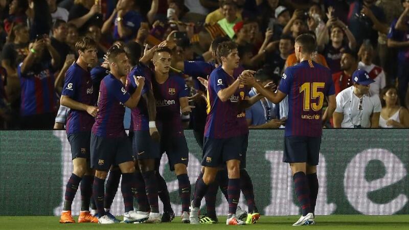 لاعبو برشلونة خلال المباراة مع توتنهام ضمن الكأس الدولية للأبطال