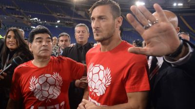 وشارك توتي ومارادونا إلى جانب عدد من نجوم كرة القدم العالمية أبرزهم رونالدينيو في مباراةٍ خيرية استضافها ملعب أولمبيكو في العاصمة الإيطالية روما أمس الأربعاء تحت رعاية البابا فرانسيس يذهب ريعها لجمعيات خيرية.