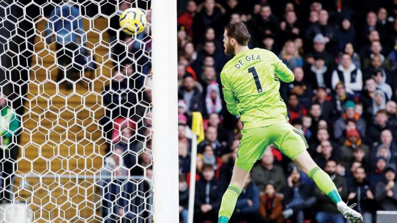دي دخيا يحاول جاهداً تصحيح خطأه دون جدوى بعدما أفلتت الكرة بين يديه معلنة الهدف الأول لواتفورد