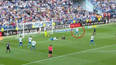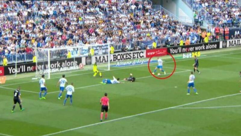 وبدا مدافع ملقة مايكل فيلانويفا في اللقطة وكأنه يقفز فوق الكرة ليسمح بمرورها إلى النجم كريستيانو رونالدو الذي كان خلفه واستلم الكرة.