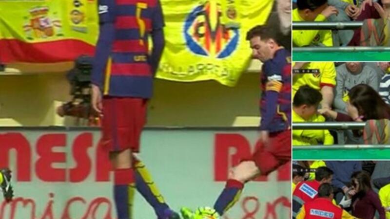 أظهرت لقطات فيديو من مباراة فياريال وضيفه برشلونة ضمن المرحلة الثلاثين من الدوري الإسباني تسبب ليونيل ميسي بنقل إحدى المشجعات إلى المستشفى.