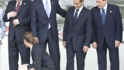 ومنهم الرئيس الأمريكي باراك أوباما الذي التقط له صورة تجمعه مع الرئيس الفرنسي نيكولا ساركوزي وهما ينظران إلى مؤخرة سيدة تمر أمامهما.