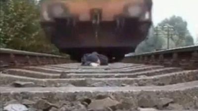 ونجا الرجل من الموت بفارق بوصة واحدة وهو يضغط نفسه إلى الأرض بشدة بينما القطار يمر من فوقه.