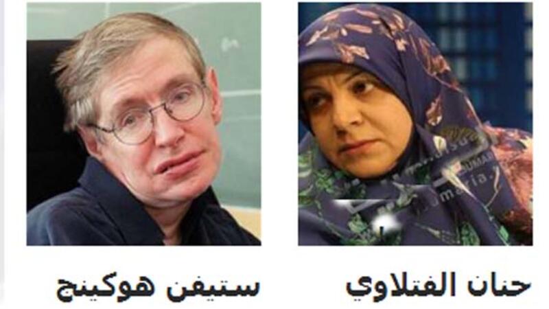 نشر على أحد المواقع الالكترونية العراقية صورتان وخبران متجاوران، الاول يتحدث عن وفاة عالم الفيزياء الكبير ستيفن هوكينج، والثاني يعلن عن محاسن المرشحة العراقية للانتخابات، زعيم قائمة إرادة، حنان الفتلاوي .