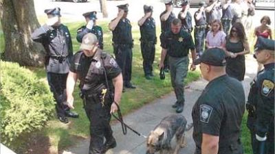 في مدينة بليموث التابعة لولاية ماساتشوستس الأميركية، اصطف نحو 20 ضابط شرطة وأدوا التحية العسكرية لكلب من كلاب الاثر خلال مراسم وداعية رسمية أقيمت قُبيل إعدامه لإراحته من آلام مرض الفشل الكلوي الذي استعصى على الاطباء علاجه.
