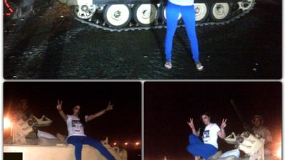 فعبر تغريدة على حسابها الرسمي على "تويتر"، نشرت "هيفاء" أمس الأحد ثلاثة صورة وهي تشير بعلامة النصر، بجوار المدرعة في صورة، وفوقها في صورتين.